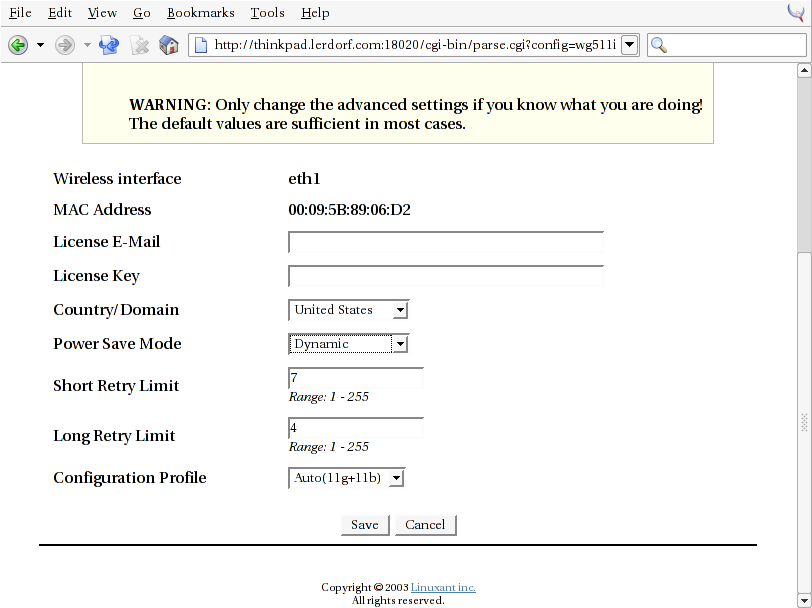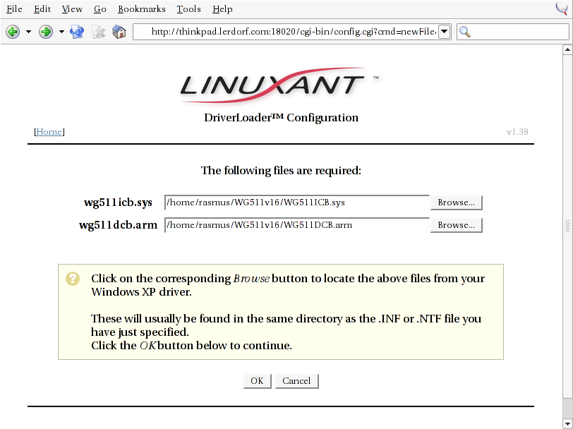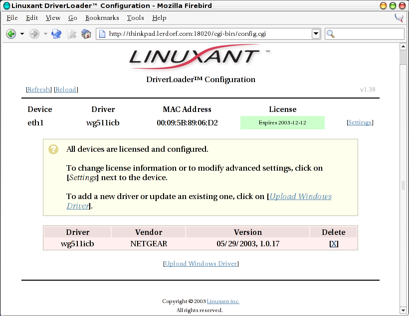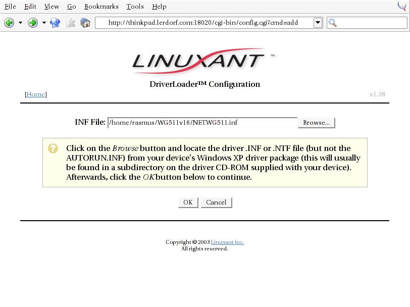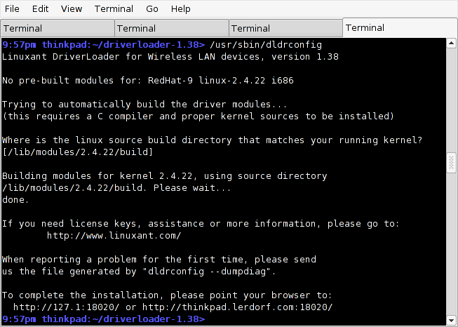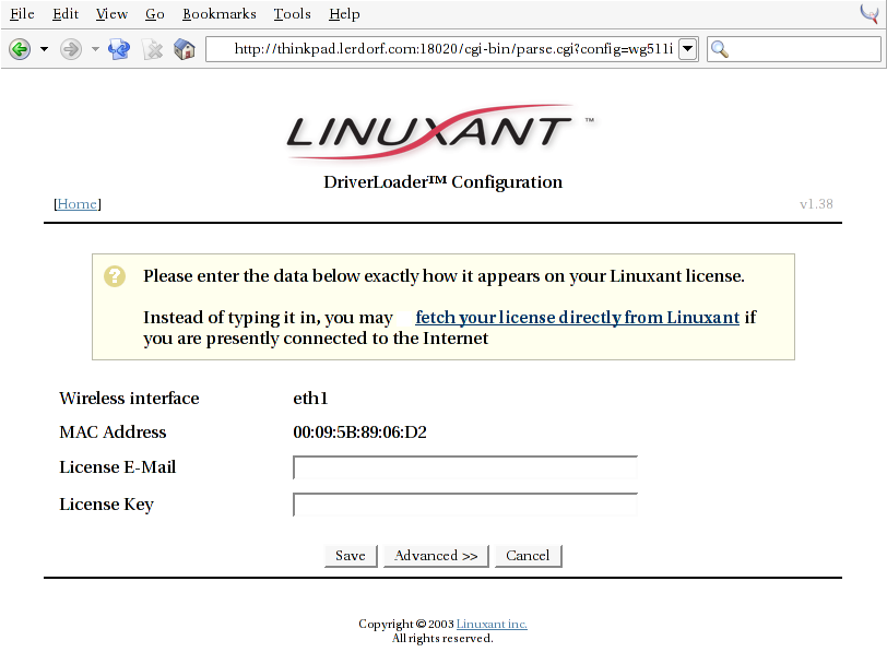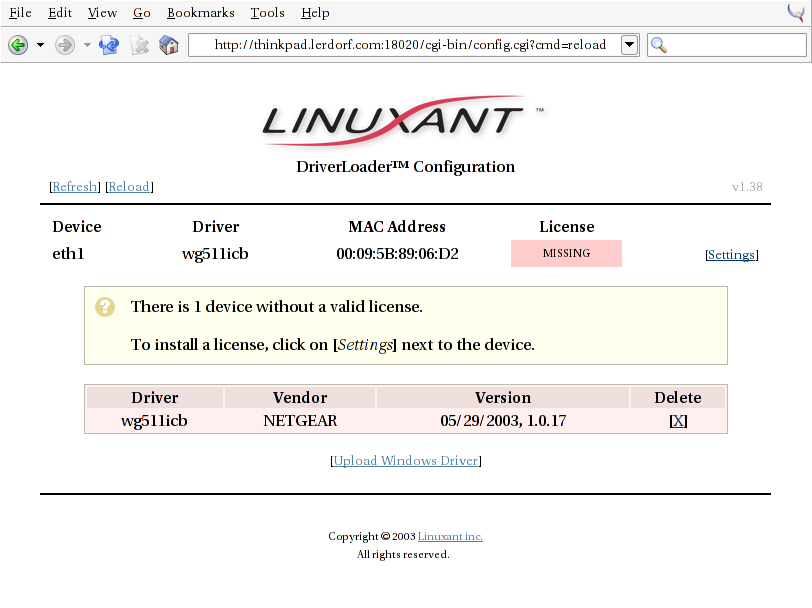 For now I wanted to give the Linuxant Driverloader a whirl to see if I could use the native Windows XP drivers directly on my Thinkpad with a very recent 2.4.22 kernel. It worked amazingly well. See the extended entry for the step-by-step screenshots.